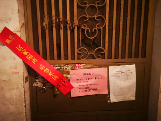 旅游局家属院,一层住户在居家进行隔离,门口张贴有红色的封条