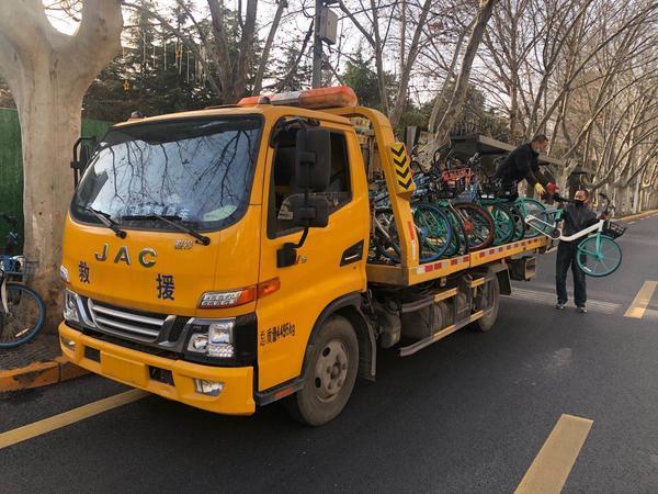 民警唐天明带领拖车在嵩山路上对乱停乱放的非机动车进行拖移,不到一个小时,各类违停车辆已经被装满了一车。据黄晓伟介绍,嵩山路是9条严管示范路之一,在人行道上施划有非机动车停车位,这些被拖走的非机动车都是在停车线以外违法停放的车辆,除了共享单车外,乱停放的其他非机动车和机动车也会被拖移。从今日起,郑州交警重新开始严管模式,特别是主干道,希望市民遵守交通法规,文明出行。