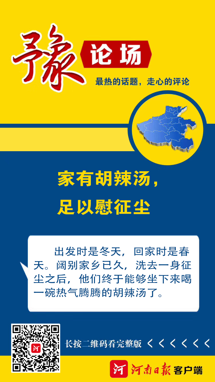 他们出发时是冬天,回家时是春天。阔别家乡已久,洗去一身征尘之后,他们终于能够坐下来喝一碗热气腾腾的胡辣汤了。此刻,尽情品味生活,就是对这个春天最真切的致意。