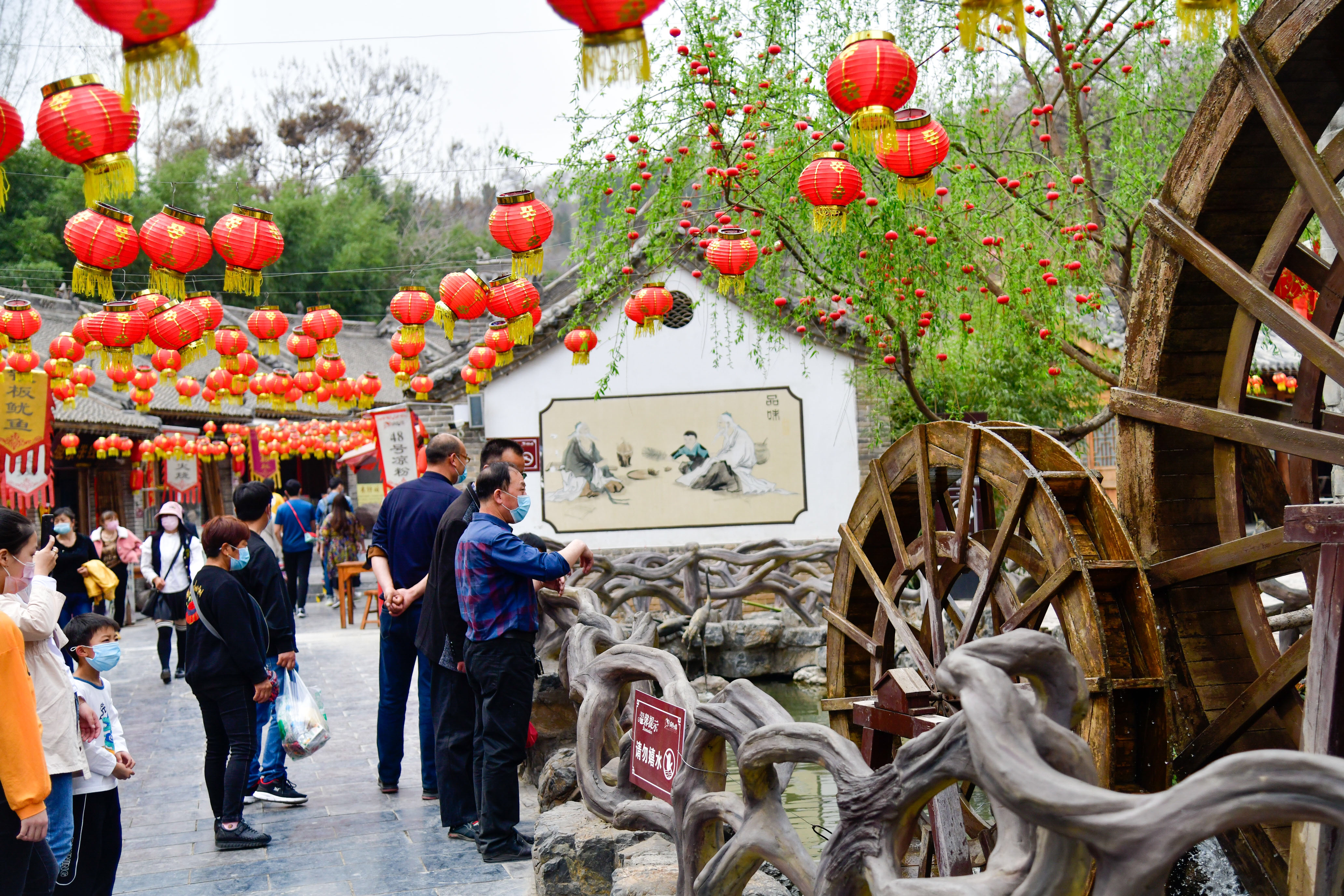 上午9点,记者在康百万庄园景区看到,游客们戴着口罩,正有序地排队登记、购票、扫码、测温,准备进入景区参观。园内,有专人对公共区域喷撒消毒液。