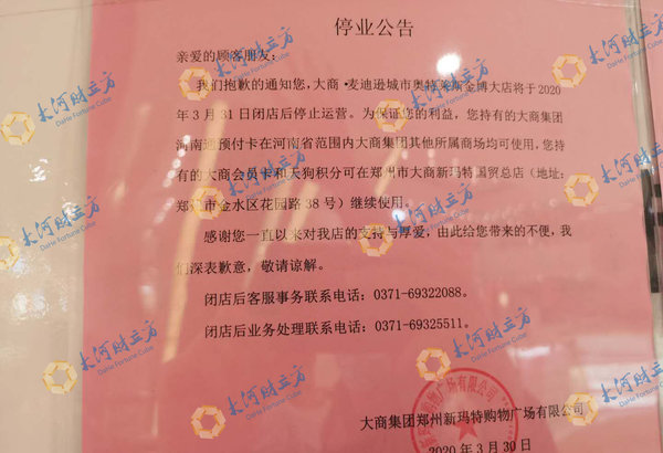 3月30日下午,因大商新玛特金博大店即将停业闭店,大商郑州地区集团针对大商·麦迪逊城市奥特莱斯金博大店发布专项公告称,“大商郑州地区集团已通知河南麦迪逊商业管理有限公司于3月31日终止合同,并依据合同约定于4月5日前将场地内物品清空。”