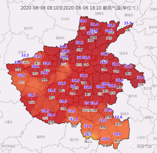最低温度:西部山区、东南部20到22度;北部24到26 度;其它地区22到24度。最高温度:西部31到33度;南部33到35度;其它地区35到37度。