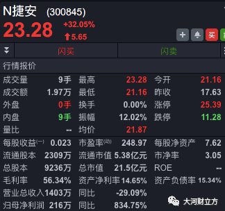 9点26分,随着深交所开市宝钟被敲响,捷安高科正式登陆A股资本市场,证券简称为“捷安高科”,证券代码为“300845”。捷安高科开盘股价上涨32.05%,至23.28元/股,总市值21.5亿元。