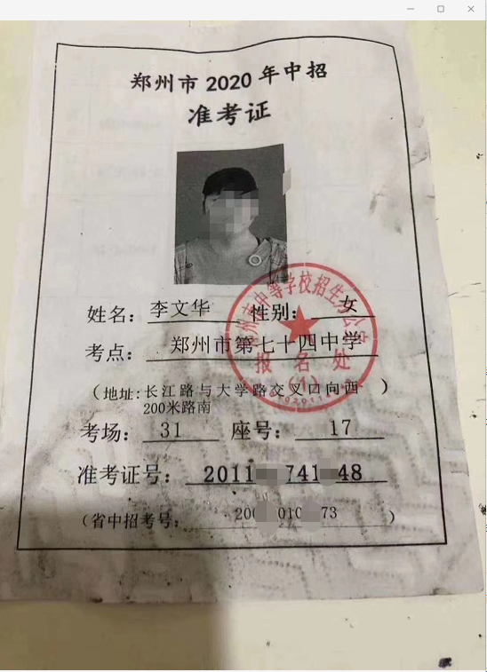 7月15日就要开始中考了,急考生所急,大河报•大河客户端于14日晚10点多以《急急急!谁认识李文华?明天就要考试了,她的中招准考证在这里!》为题报道扩散此事,希望失主看到尽快领走,以免耽误考生正常考试。