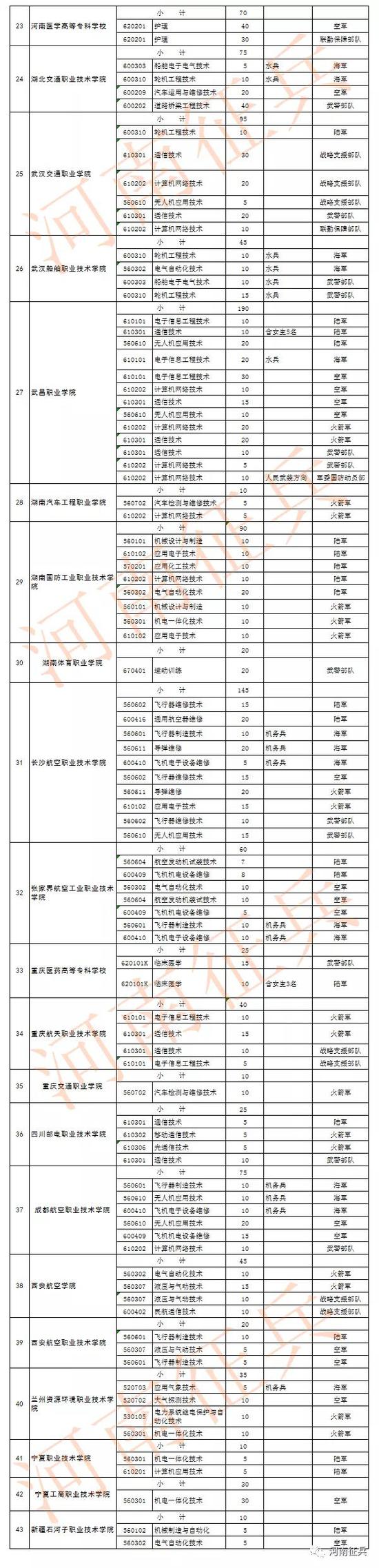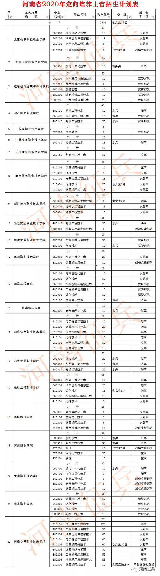 在国家核定的43所地方高校2020年高职(专科)层次招生计划内,为陆军、海军、空军、火箭军、战略支援部队、军委国防动员部、武警等单位招收定向培养士官生2506人(含女士官34人),招生计划见下表(具体计划以河南省招生办公室印发的《招生考试之友》为准)。