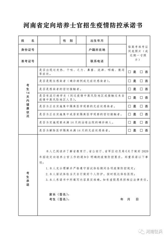 面试体检前,考生登录河南省招生办公室网站下载《河南省定向培养士官招生疫情防控承诺书》(式样见下表,可选择图片另存直接打印),填写体检前14天内健康状况,并就遵守疫情防控规定做出承诺。进入面试体检等待区前,需检查考生《疫情防控承诺书》、健康码,并测量体温。体检前14天以内有疫情中高度风险地区活动史,出现过发热、咳嗽等症状,健康码非绿色,或当日体温超过37.3℃等情况的考生,统一持3日内核酸检测报告,于8月18日到指定地点(体检现场告知)进行面试体检。