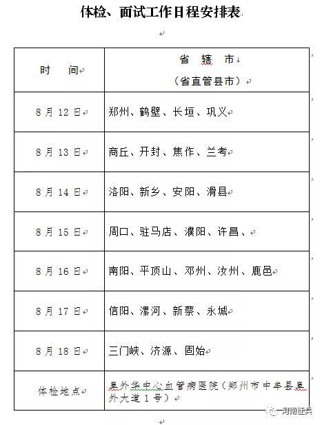 (三)体格检查和面试。体检工作由河南省人民政府征兵办公室按照《直接从非军事部门招收士官工作规定》组织实施。体检、面试时间:8月12日至18日,地点:阜外华中心血管病医院(郑州市中牟县阜外大道1号)。