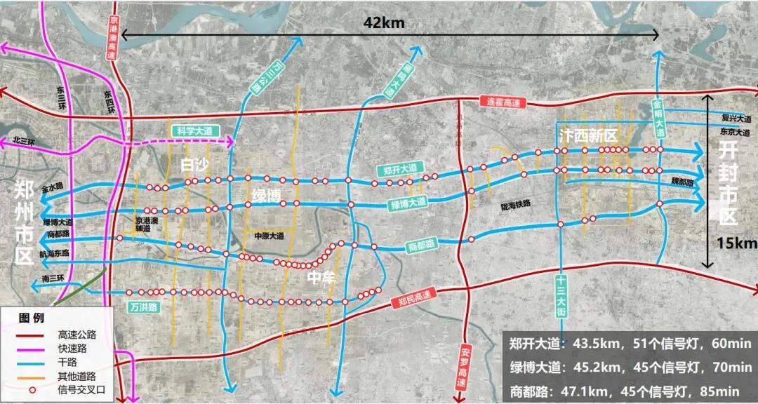 《汇报》中指出,郑州到开封现有三条主干路:郑开大道、绿博大道(郑汴物流通道)和商都路,由于红绿灯密集,快速通行效率较低,运行时间均超过1小时。其中,郑开大道43.5公里,51个信号灯;绿博大道45.2公里,45个信号灯;商都路47.1公里,45个信号灯。