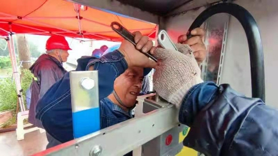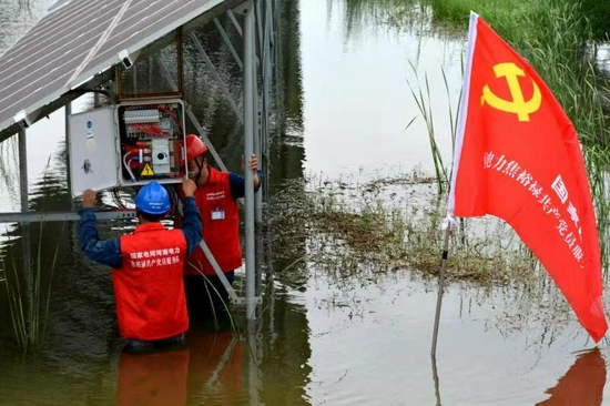 国网平舆县供电公司共产党员服务队组织抢修人员,深入齐腰深的积水中对光伏发电设备进行紧急抢修。张攀 摄