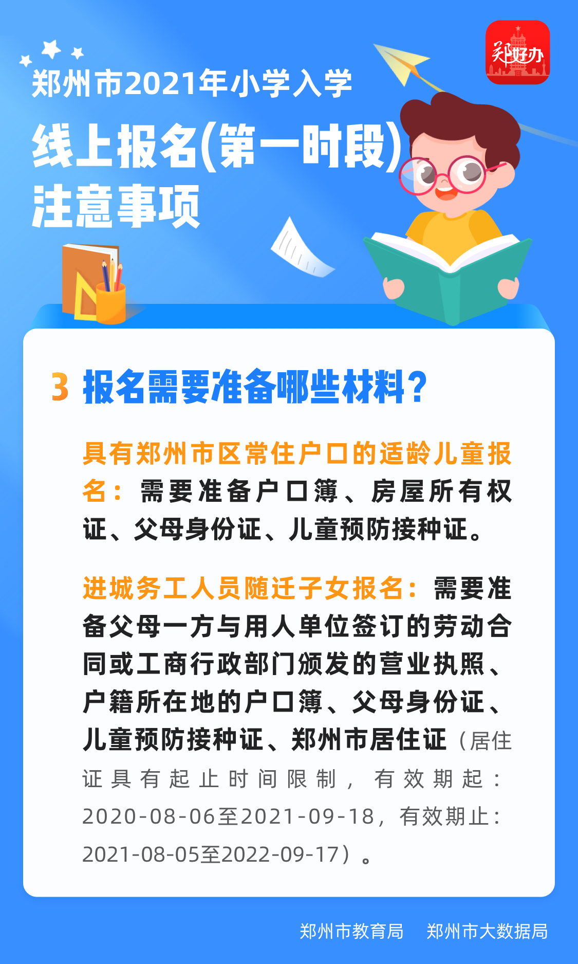 进城务工人员随迁子女报名:需要准备父母一方与用人单位签订的劳动合同或工商行政部门颁发的营业执照、户籍所在地的户口簿、父母身份证、儿童预防接种证、郑州市居住证,申请人居住证具有起止时间限制,有效期起:2020-08-06至2021-09-18,有效期止:2021-08-05至2022-09-17。