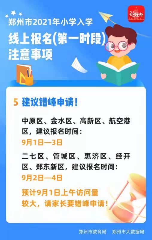 二七区、管城区、惠济区、经开区、郑东新区建议报名时间:9月2日—4日。