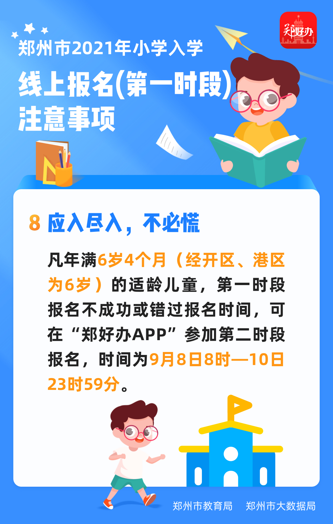 第二时段报名时间为9月8日8时—10日23时59分,第一时段报名不成功或错过报名时间,可参加第二时段报名,请家长朋友持续关注“郑好办”App。