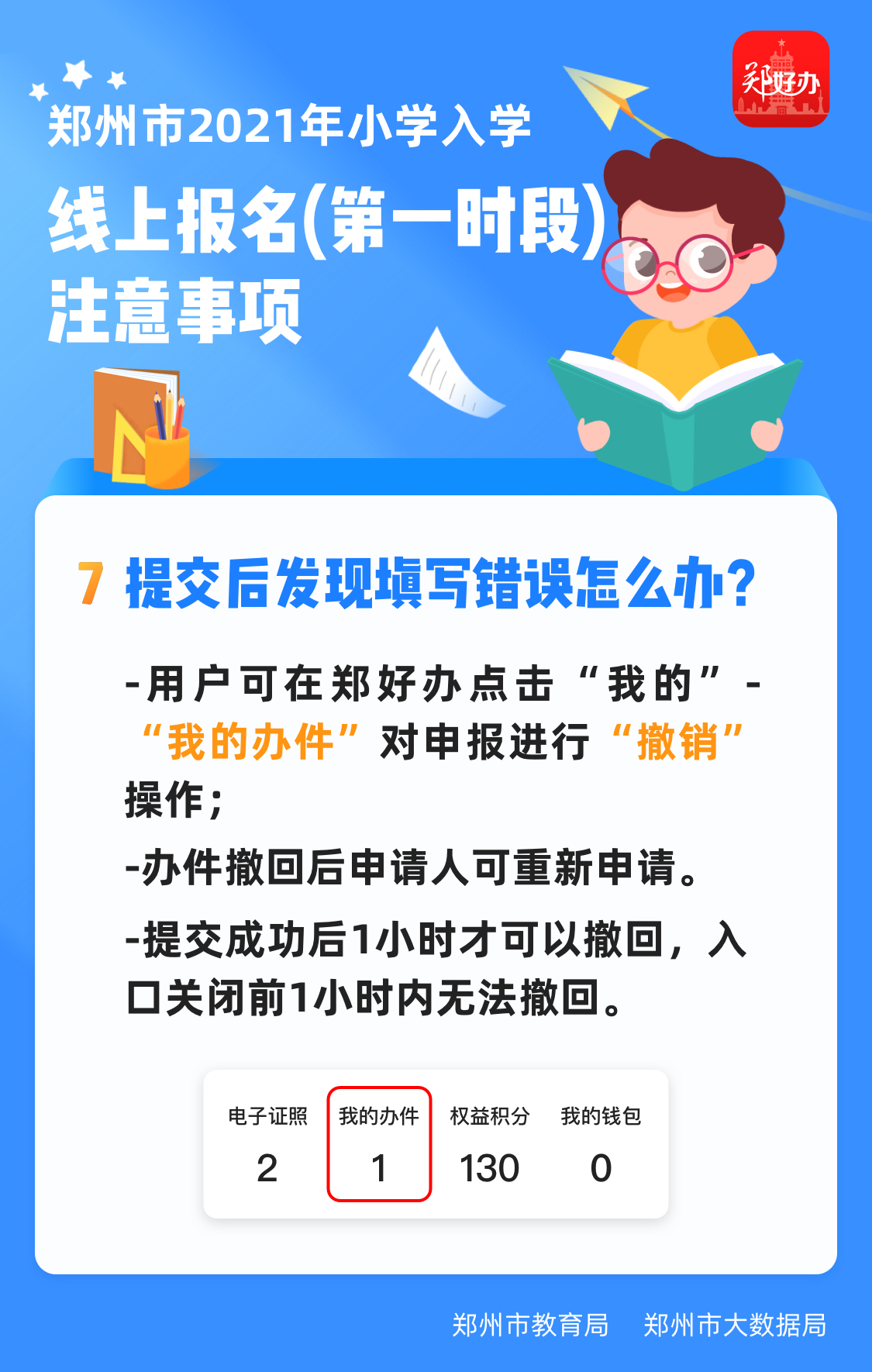 注意!线上报名成功后如对此次申请有异议,申请人可在入口开放期间通过郑好办“我的办件”页面对此次申报进行“撤销”操作(办件提交成功1小时后才可以撤销,入口关闭前1小时内将无法撤销),办件撤销后申请人可重新申请。