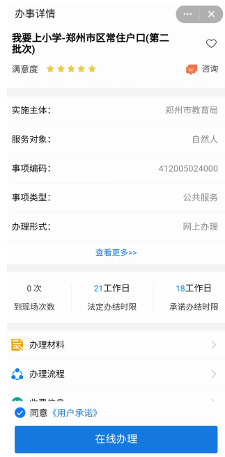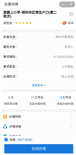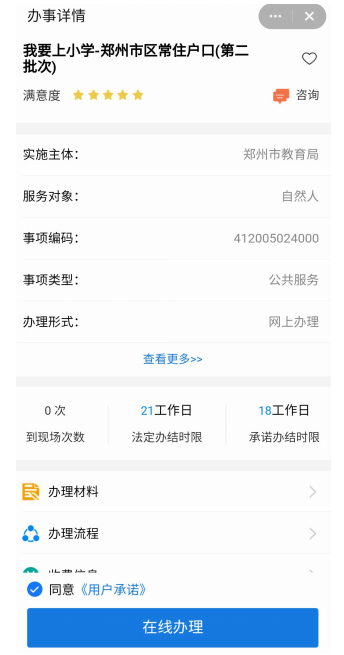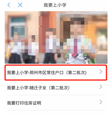 1.用户登录郑好办 app,从一件事专区进入我要上小学一件事,进入郑州市区常住户口(第二批次) 业务办理。