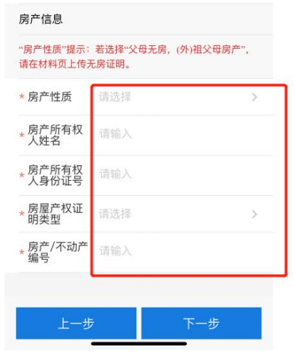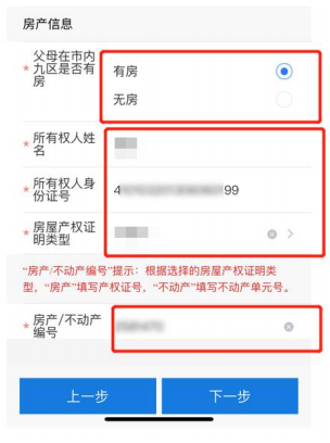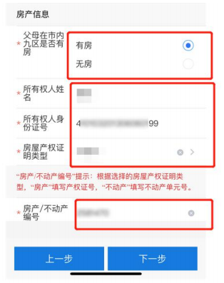 6.选择在市内九区有房或无房 。有房:填写所有权人姓名、身份证号、产权 证明类别、房产/不动产编号。点击下一步进入监护人信息填写页面。