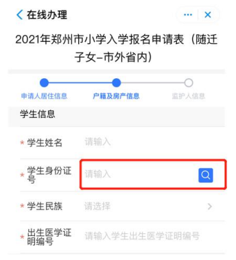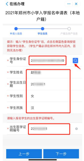 5.输入学生身份证号 ,点击右侧蓝色按钮,自动获取学生姓名、出生日期、 性别、民族信息,并输入学生出生医学证明编号,点击下一步进入户籍及房产信息填写页面。