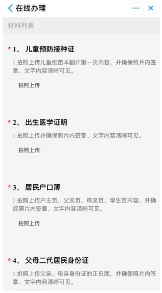 10.申请人仔细阅读材料上传要 求 ,分别上传儿童预防接种证、出生医学证明、居民户口簿、父母二代居民身份证、房产证或不动产权证、其他证明材料。