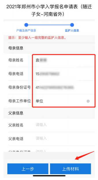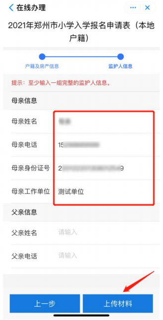 7.至少输入一组监护人的完整信息: 包括姓名、电话、身份证号、工作单位。点击上传材料,进入申请材料上传页面。