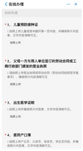 9.申请人仔细阅读材料上传要求 ,分别上传儿童预防接种证、父母一方与用 人单位签订的劳动合同或工商行政部门颁发的营业执照、出生医学证明、居民 户口簿、父母二代居民身份证、居住证、房产证或不动产权证、其他证明材 料。