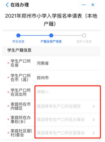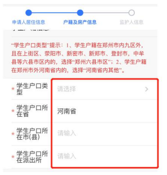 6.选择学生户口类型: 郑州六县市区、河南省内其他。输入学生户口所在市 (县)、户口所在派出所。