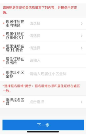 4.系统自动获取 申请人姓名、手机号码、身份证号,点击身份证号右侧蓝色按钮,自动获取居住证号、居住证有效期。输入现居住详细地址、居住小区全称,选择居住所在市辖区、办事处、居(村)委会、辖区派出所、报名区域。点击下一步进入户籍及房产信息页面。