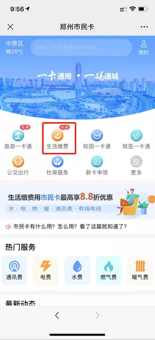 2、点击首页“生活缴费”活动入口,郑州市民卡用户在本平台首次进行水、电、燃气、暖气、通讯费等生活缴费可享受8.8折起优惠。(活动期内,每人最多享受1次优惠;各优惠力度名额有限,先到先得)