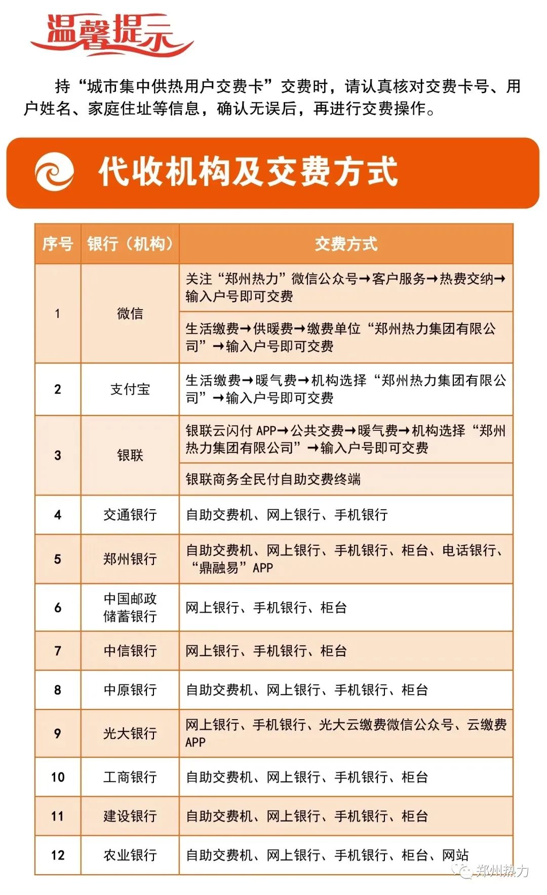 今年,郑州热费代收机构新增了农业银行,用户可持城市集中供热用户交费卡到交通银行、中信银行、郑州银行、中国邮政储蓄银行、工商银行、中原银行、光大银行、建设银行、农业银行9家银行代收机构交费。热力集团客服中心及所属各供热分公司客服大厅均安装有全民付终端,亦可交纳热费。