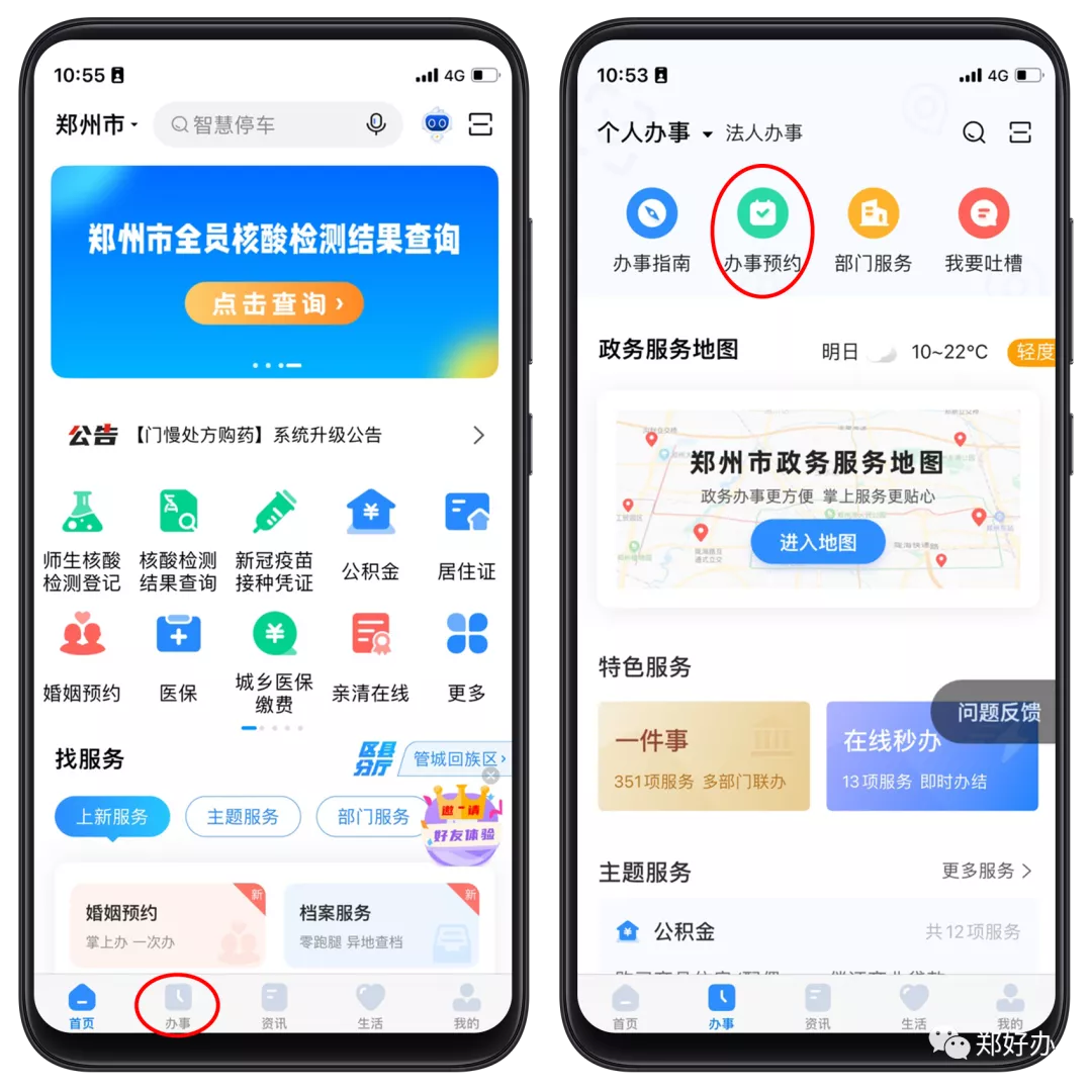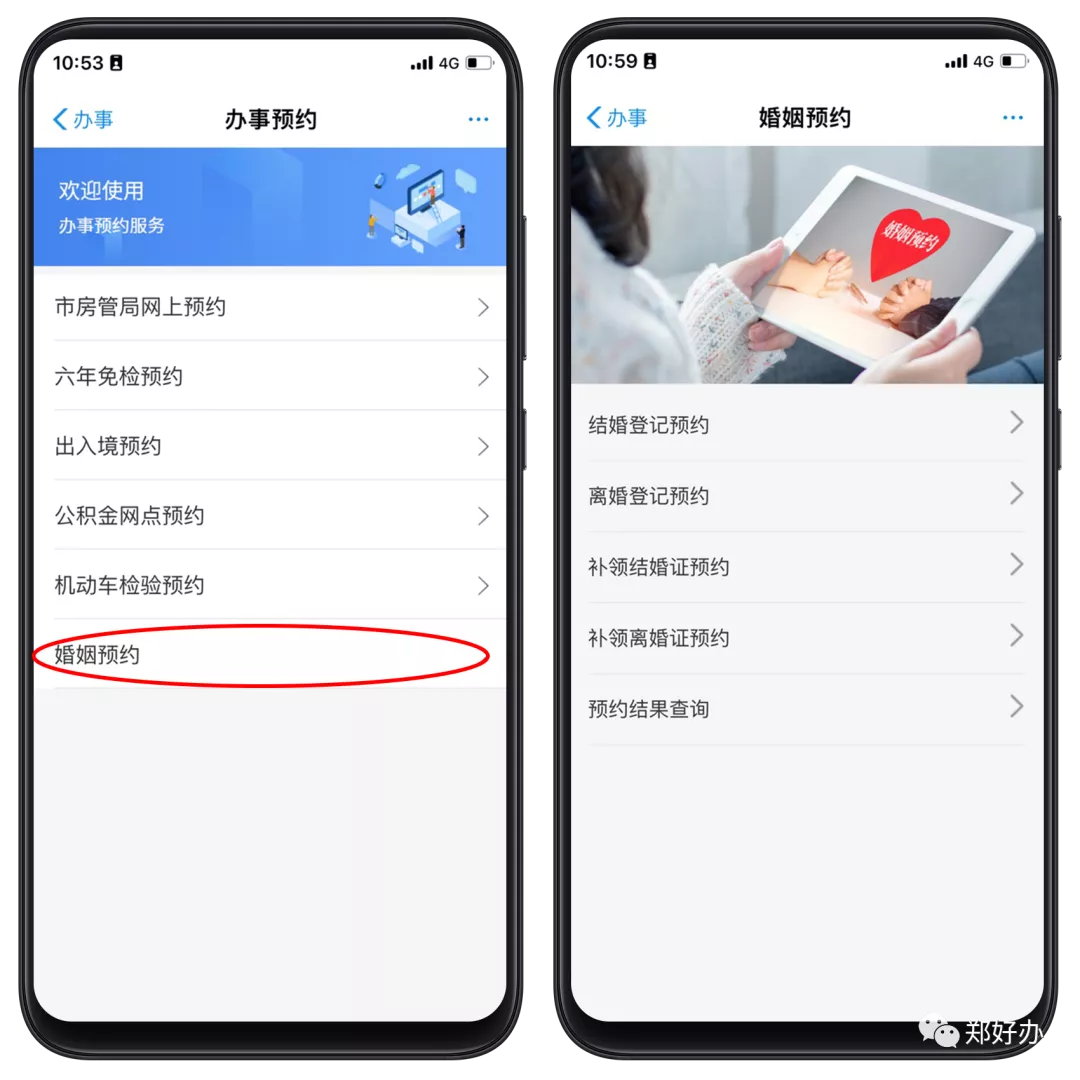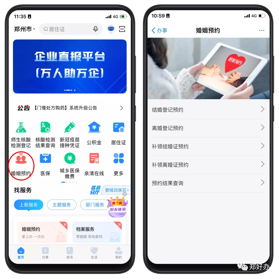 1.市民下载注册并登录郑好办App,点击首页“婚姻预约”,选择相应事项即可。