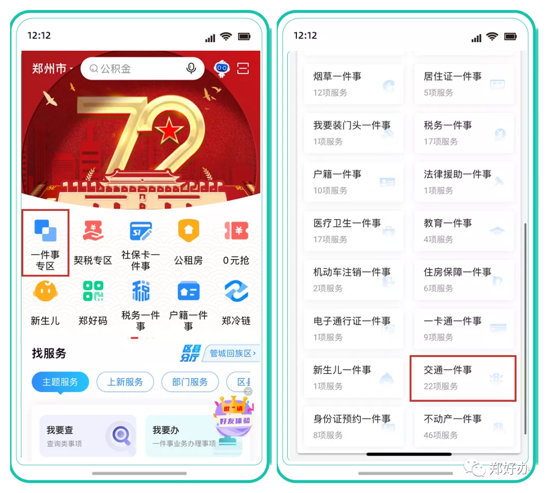 一、用户登录郑好办App,在首页第二屏找到“一件事专区”按钮,进入后点击“交通一件事”,或搜索“交通一件事”进入“交通一件事”专区。