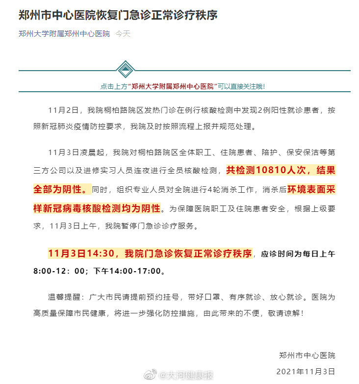 为保障医院职工及住院患者安全,根据上级要求,11月3日上午,郑州市中心医院暂停门急诊诊疗服务。