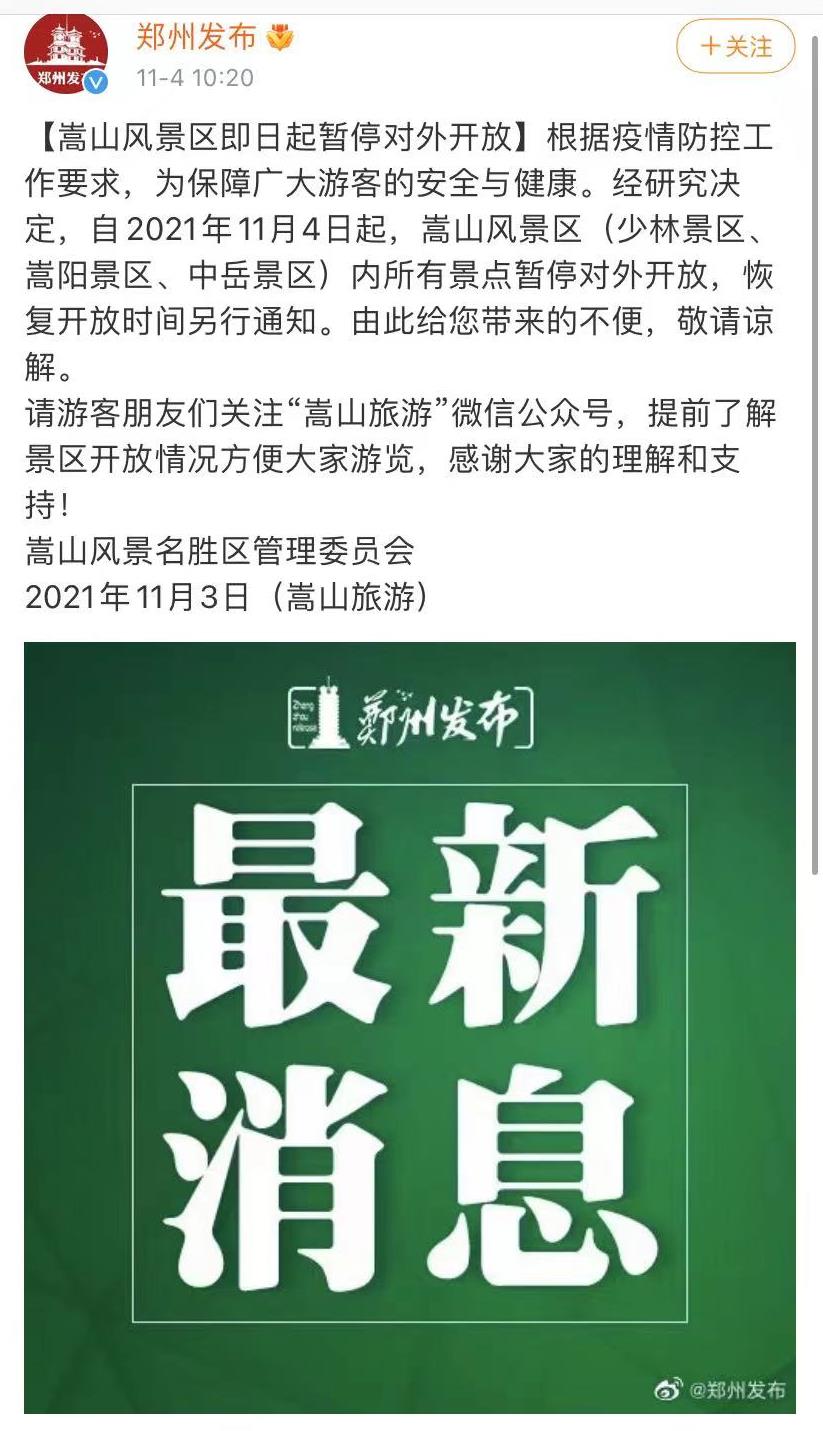 根据疫情防控工作要求,为保障广大游客的安全与健康。经研究决定,自2021年11月4日起,嵩山风景区(少林景区、嵩阳景区、中岳景区)内所有景点暂停对外开放,恢复开放时间另行通知。由此给您带来的不便,敬请谅解。