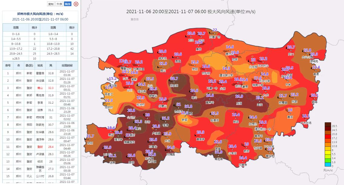 据河南省气象台消息,受强冷空气影响,昨日06时-今日06时,中西部部分地区出现9~10级大风,许昌、平顶山、三门峡、洛阳、郑州局地阵风11~12级,最大风速出现在平顶山卫东山顶公园39.2米/秒(13级)。郑州大部阵风7~8级,局地10~11级,最大风速新密霍雷庙32.8米/秒(12级)。