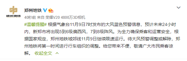 11月9日,郑州地铁消息:根据气象台11月9日7时发布的大风蓝色预警信息,预计未来24小时内,新郑市将出现5到6级偏西风,7到8级阵风。为全力确保乘客和运营安全,根据国家规定,郑州地铁城郊线11月9日继续限速运行。待大风预警调整或解除,郑州地铁将第一时间进行行车组织的调整。给您带来不便,敬请广大市民乘客谅解。