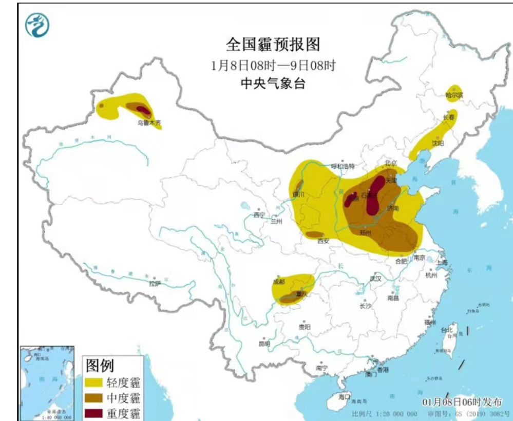 根据中央气象台预计,今明两天(8-9日),宁夏、陕西、山西、北京东南部、天津、河北中南部、河南、山东、苏皖中北部等地的部分地区有轻至中度霾,其中,河北中南部、山东西部、河南中北部等地的部分地区有重度霾。