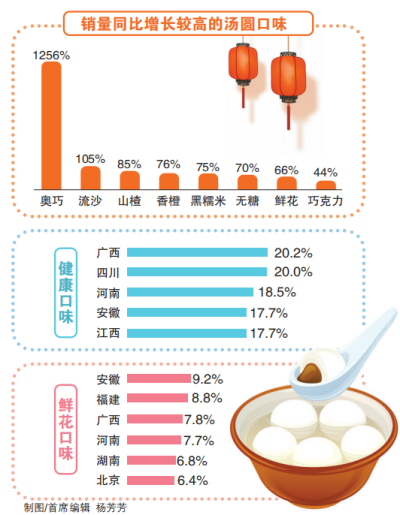 今年元宵节前,很多新口味的汤圆获得了消费者的青睐。奥巧馅汤圆销量同比增长12.6倍,咸味的流沙汤圆销量同比增长超过1倍。此外,山楂、香橙、黑糯米汤圆销量同比增长超过75%,代表健康趋势的无糖汤圆销量同比增长70%。