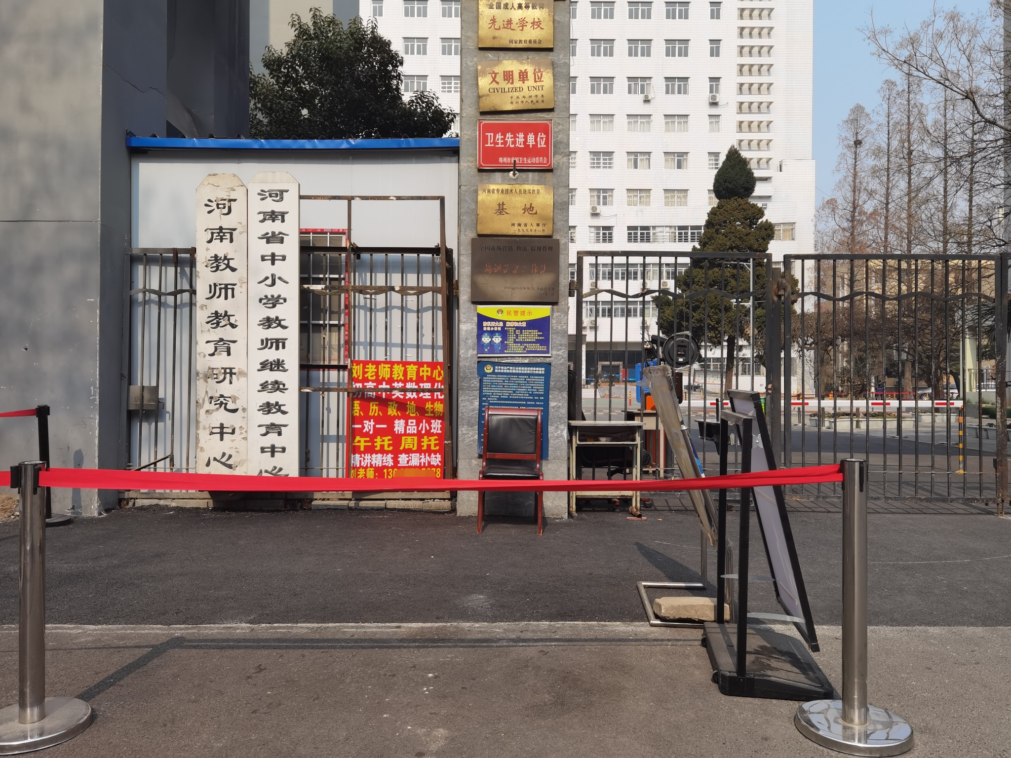 有市民向大河报反映,在郑州市纬五路上的经纬中学(原河南教育学院)大门口,一个校外学科类培训广告异常醒目。