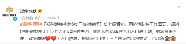 接上级通知,因疫情防控工作需要,郑州地铁柳林站C口于3月25日起临时关闭,期间您可选择其他出入口进出站,出入口信息:柳林站C口位于三全路花园北路交叉口西北角。