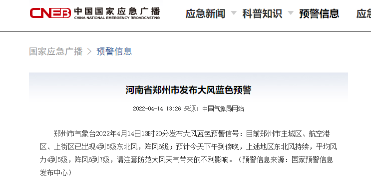郑州市气象台2022年4月14日发布大风蓝色预警信号:目前郑州市主城区、航空港区、上街区已出现4到5级东北风,阵风6级;预计今天下午到傍晚,上述地区东北风持续,平均风力4到5级,阵风6到7级,请注意防范大风天气带来的不利影响。(来源:中国气象局网站)