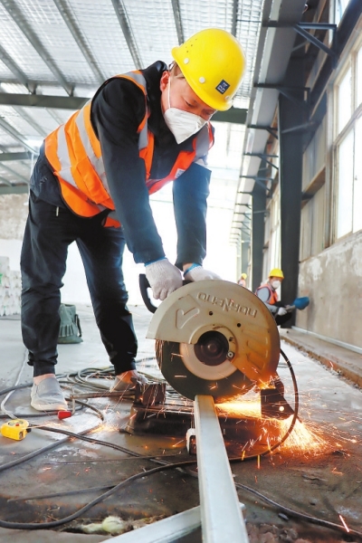 机器轰鸣、电钻声响,戴着黄色安全帽的工人们往返穿梭,施工现场一片繁忙。这是5月7日,位于郑州航空港区的郑州方舱医院建设现场。