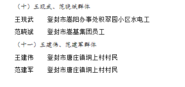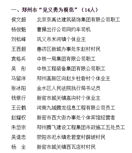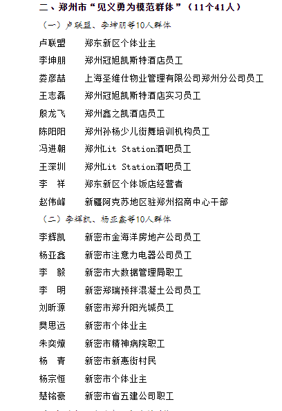 为表扬先进、弘扬正气,根据《河南省见义勇为人员奖励和保障条例》《郑州市见义勇为人员奖励和保障实施办法(试行)》(郑政办〔2020〕39号),市政府决定授予侯文超、杨俊魁等14名个人郑州市“见义勇为模范”称号,给予每人10万元奖励。授予卢联盟、李坤朋、王志磊、娄彦喆、殷龙飞、冯进朝、陈阳阳、王深圳、李祥、赵伟峰(群体)等11个群体郑州市“见义勇为模范群体”称号,给予每个群体10万元奖励。