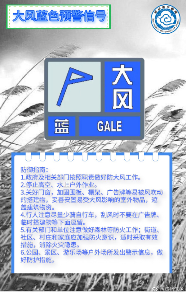 郑州市气象台2022年05月29日17时30分发布大风蓝色预警信号:目前郑州市主城区、航空港区、上街区已出现4级偏西风,阵风6-7级,预计今天傍晚至前半夜,上述地区仍有4级以上偏北风,阵风6级左右,请注意防范。