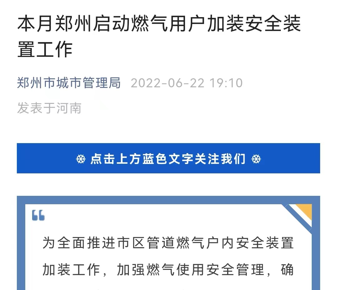 来自郑州市城管局的官方消息显示,6月起,郑州市区(中原区、二七区、金水区、管城回族区、惠济区、郑东新区、高新区、经开区)全面开展燃气用户加装安全装置工作。