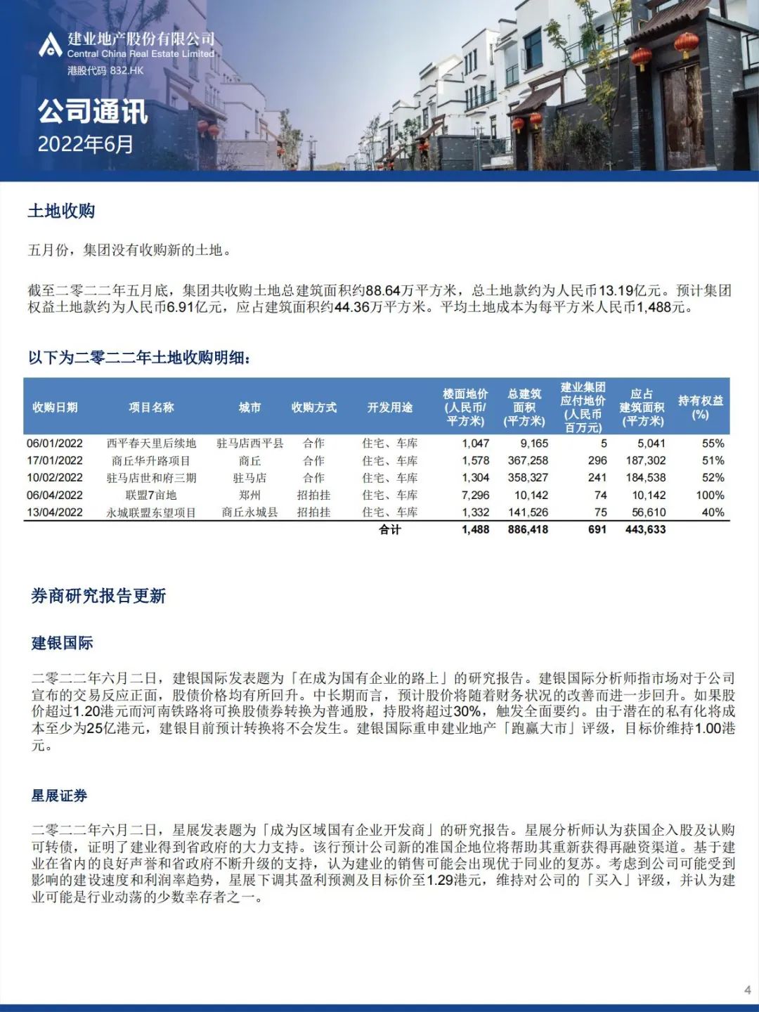 二零二二年六月一日,建业地产公布其控股股东恩辉投资有限公司(「恩辉投资」)与河南省铁路建设投资集团有限公司全资子公司河南同晟置业有限公司(「投资者」),订立了框架协定,据此,(i)待恩辉投资与投资者签订最终协议后,恩辉投资将向投资者出售本公司860,000,000 股股份,代价总额为约6.88亿港元;且(ii)待本公司与投资者签订最终认购协议后,投资者将认购本公司发行的本金额不高于7.08亿港元的2024年到期的票息5%、到期收益率9%可换股债券。