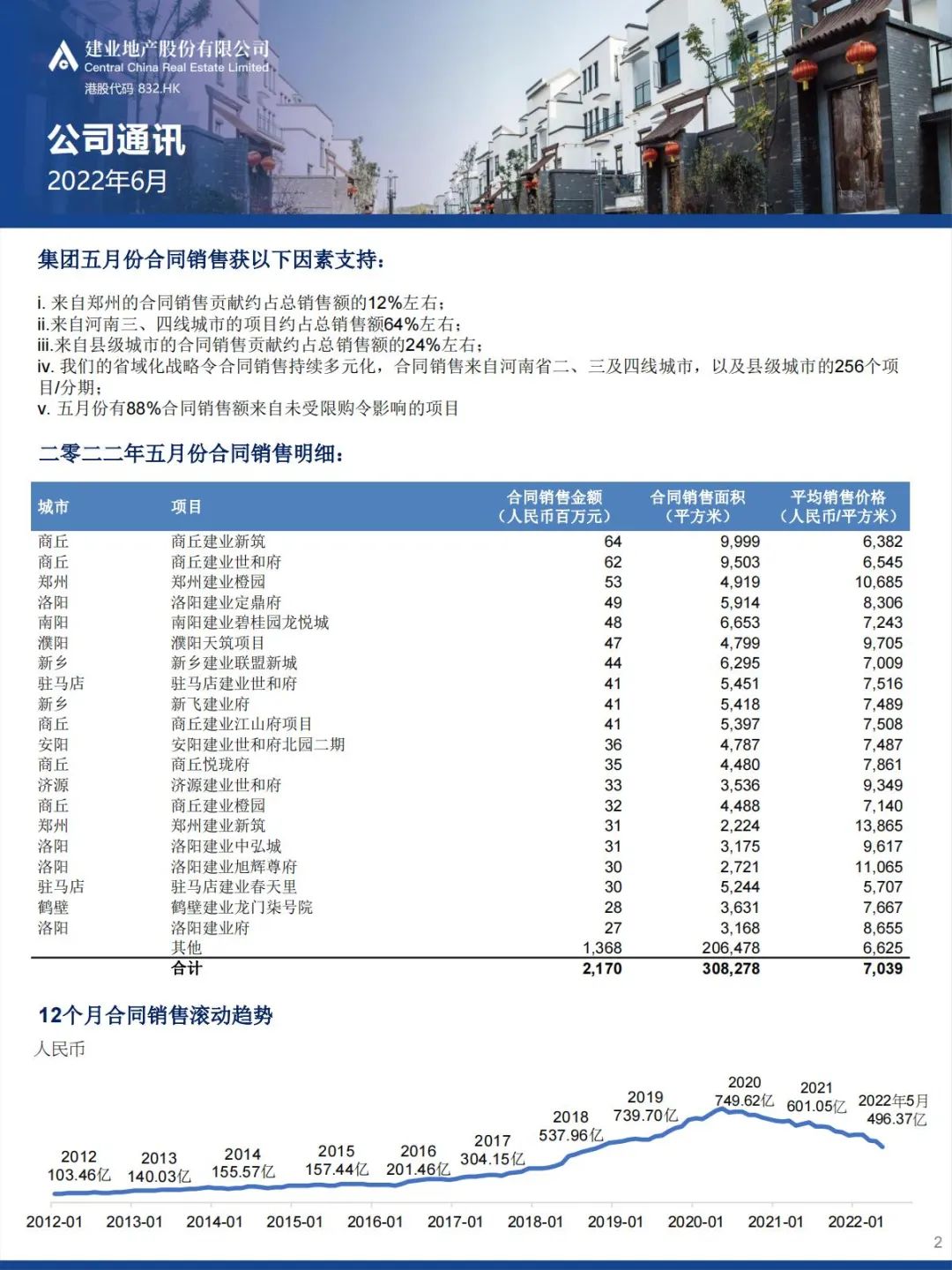 二零二二年五月单月计算,建业地产取得物业合同销售总额人民币21.70亿元,环比减少17.5%。二零二二年五月份本集团合同销售建筑面积逹308,278平方米,环比减少17.6%。二零二二年五月份之每平方米平均销售价格在人民币7,039元,环比减少0.2%。