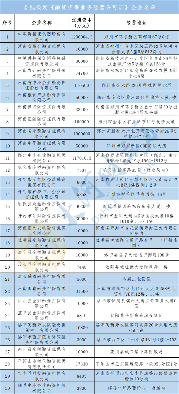 【大河财立方消息】7月20日,河南省地方金融监督管理局公布112家首批换发新版融资担保业务经营许可证企业名单。