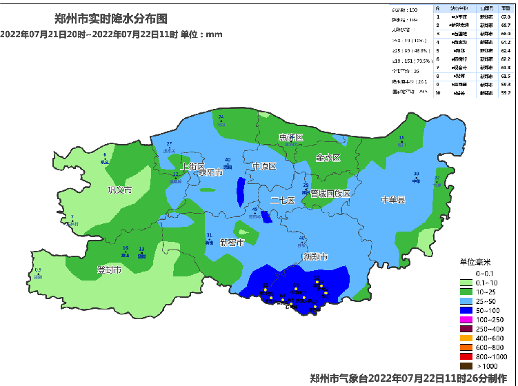 河南省气象台监测显示,7月21日20时-22日11时,三门峡、许昌、郑州、漯河、济源、洛阳、商丘部分县市出现暴雨,地市平均降水量位列前3的分别为三门峡33.1毫米、郑州25.8毫米、济源25.1毫米。