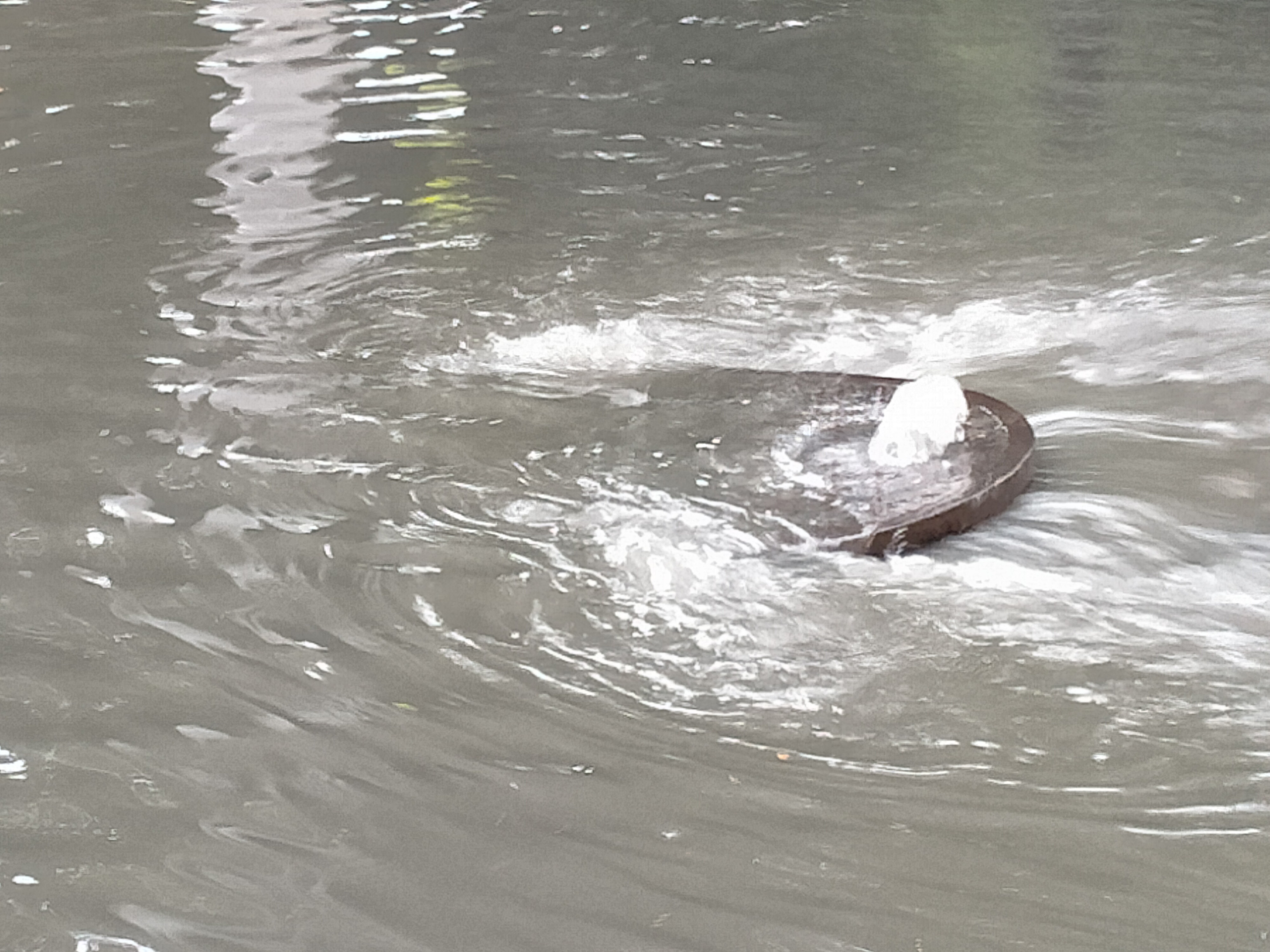 顺着该交叉口往西方向,一窨井盖“咕咕”往外不停溢水,散发出来阵阵臭味。