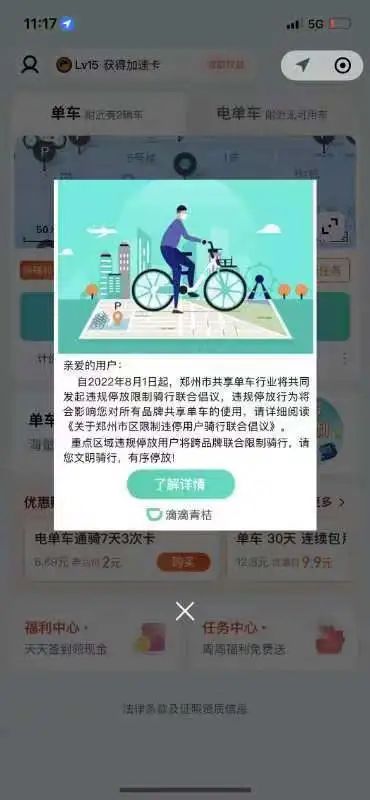 据了解,在一个自然月内,在郑州市重点区域违规停放五次以上的用户,将被纳入联合限制措施对象,下个月5个自然日内不得使用所有品牌的共享单车;连续两个月被纳入联合限制措施对象的用户,下个月10个自然日内不得使用所有品牌的共享单车。