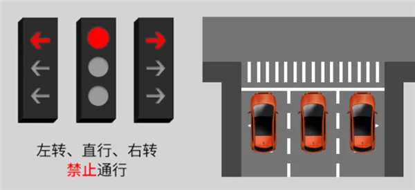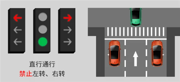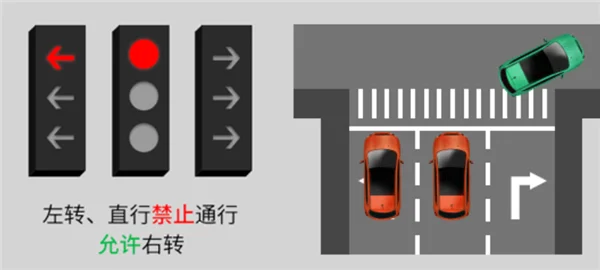 比如圆盘灯是红灯,左转弯是绿灯时,则意味着左右转弯车辆均可通行;左转弯亮绿灯,右转弯出现红灯,则意味着此时只有左转弯车辆可以通行。