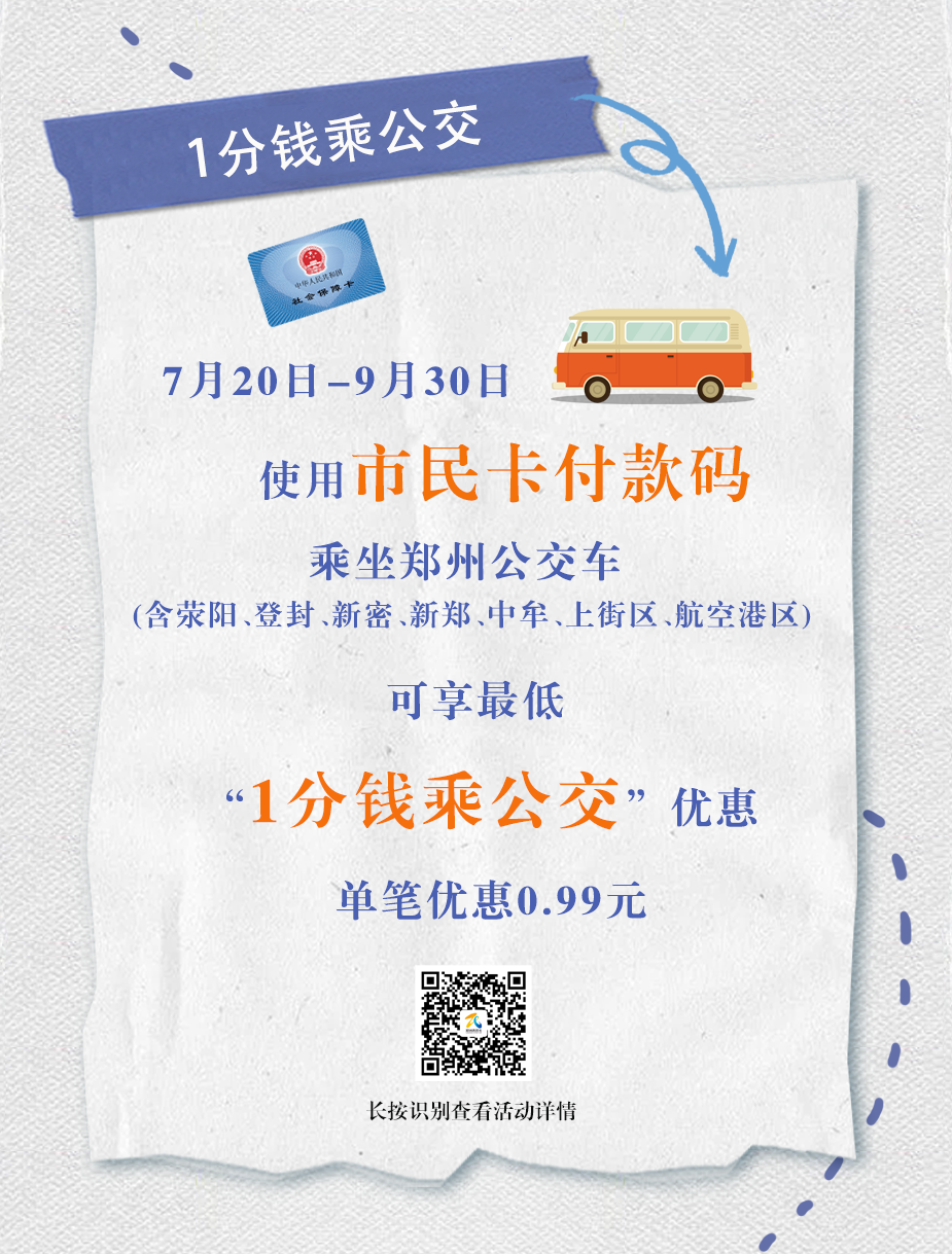 9月30日之前,使用社保卡(市民卡)付款码乘坐郑州(含登封、新密、新郑、中牟、上街区、航空港区)公交车,可享最低“1分钱乘车”优惠(单笔优惠0.99元)。